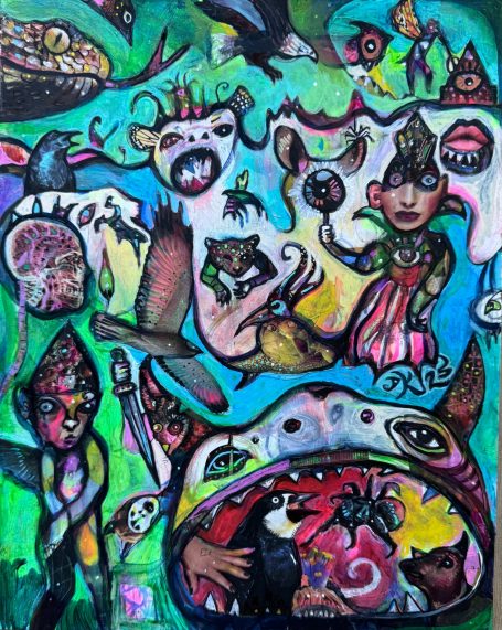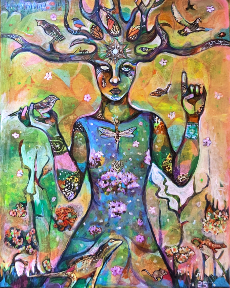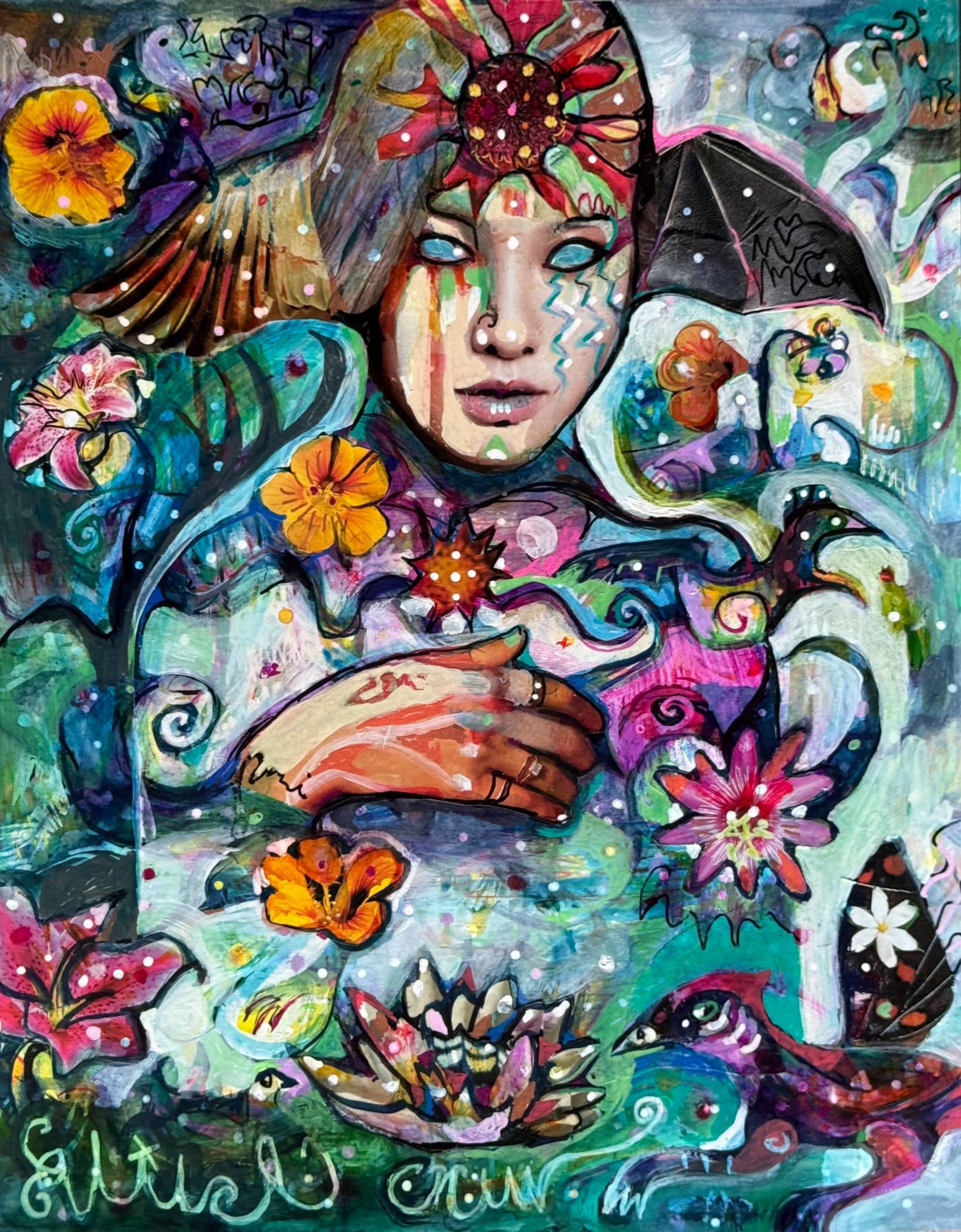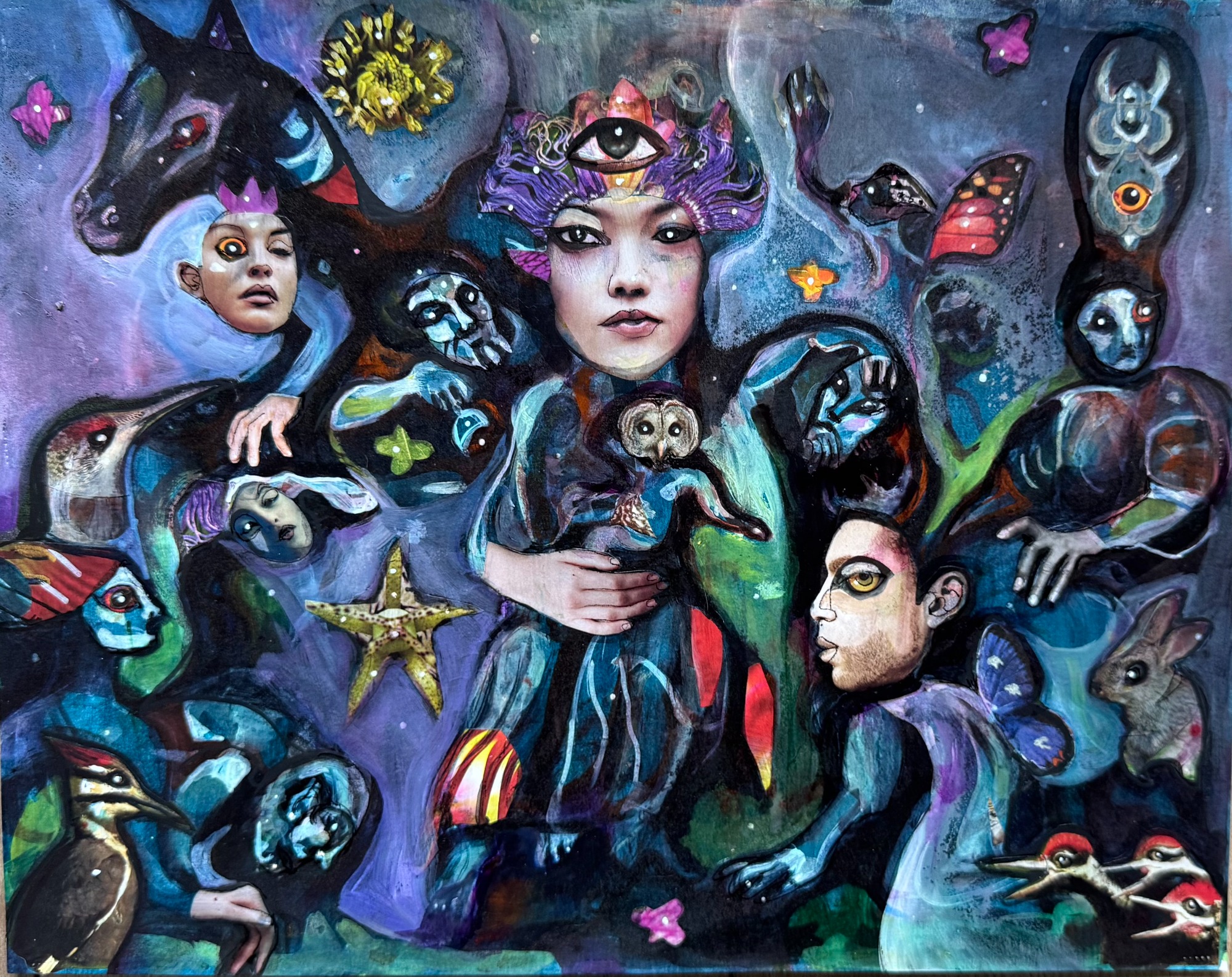 20" x 24" acrylics, collage, and paint pens on canvas (2025)