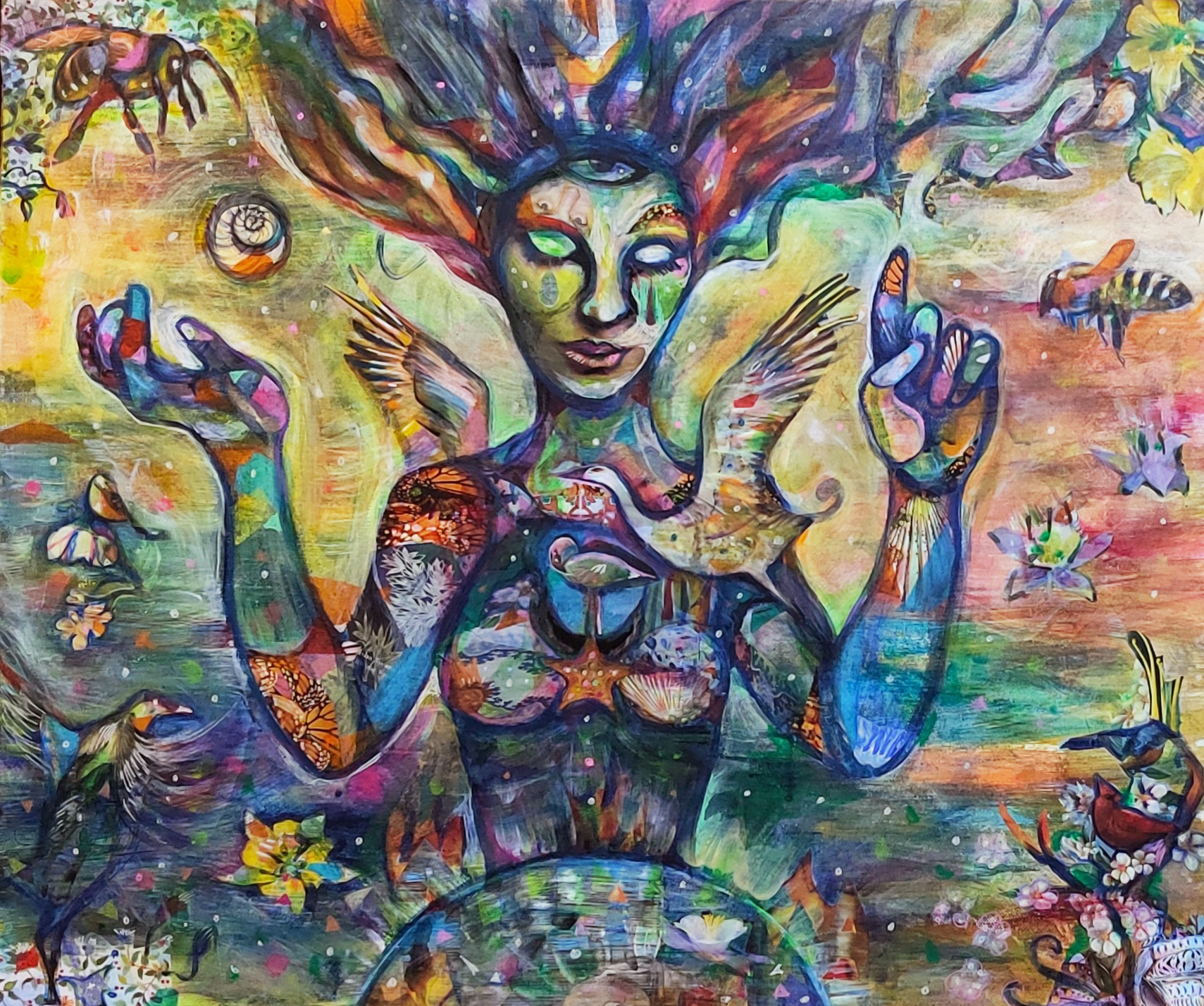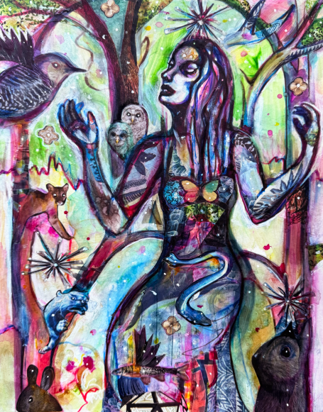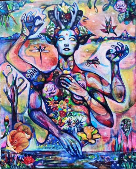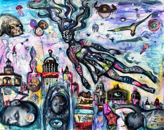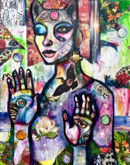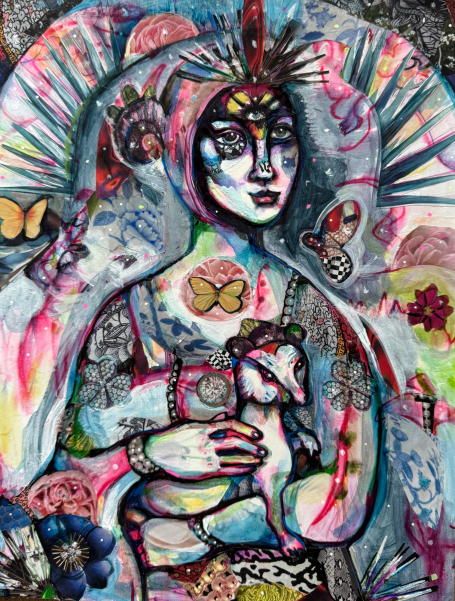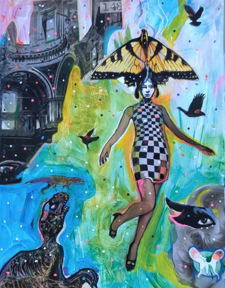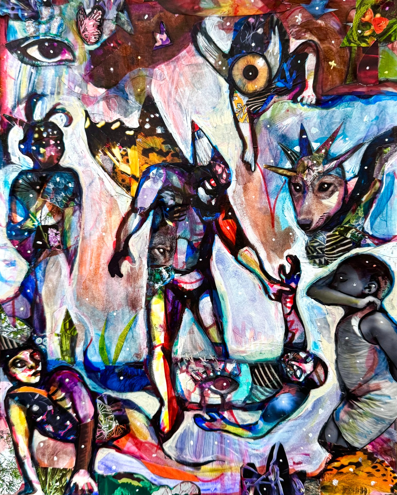 20" x 24" acrylics, collage, and paint pens on canvas (2024)