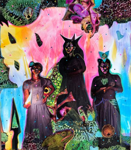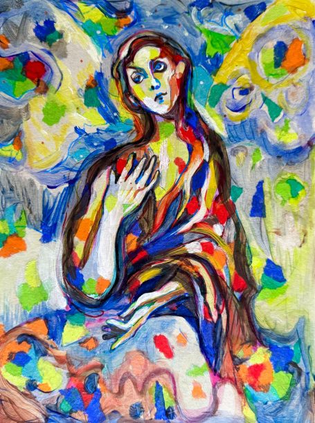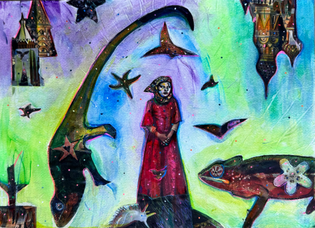 9" x 12" acrylics, collage, and paint pens on paper (2022)
