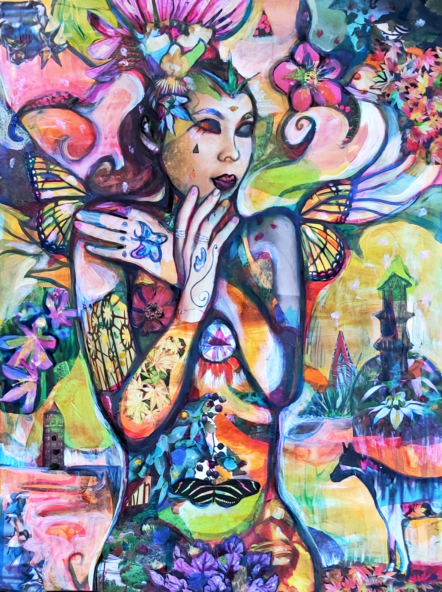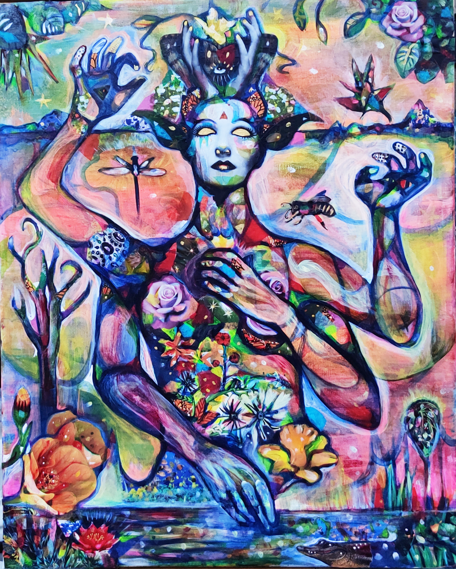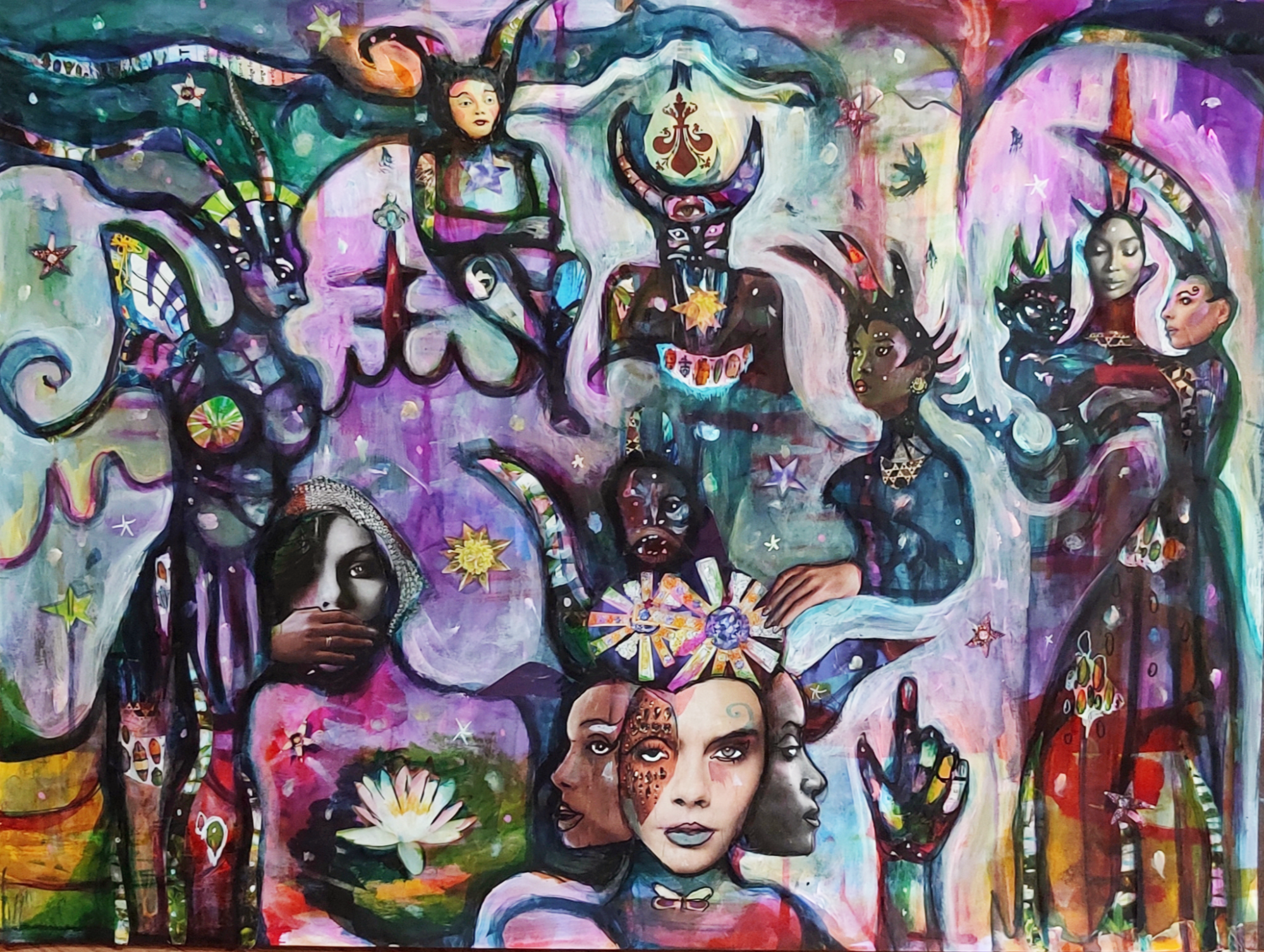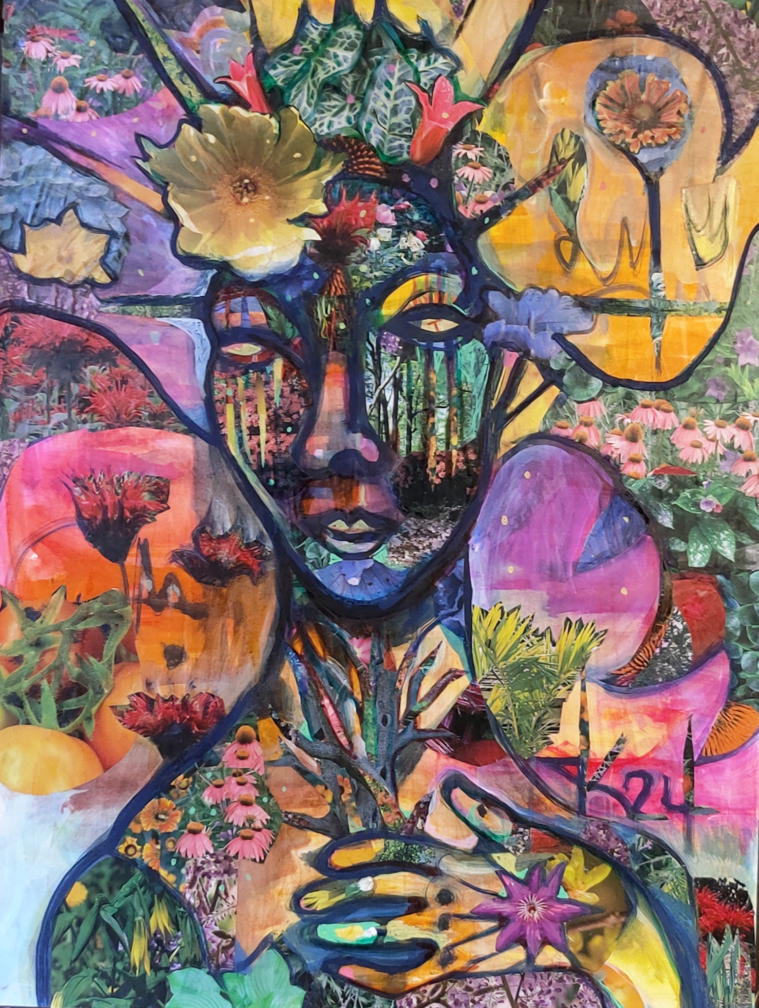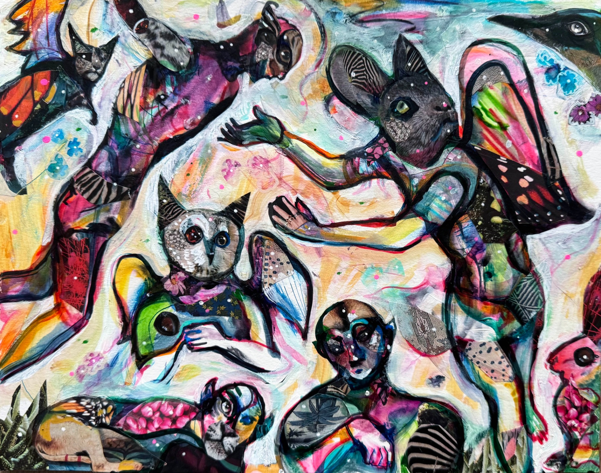 24" x 30" acrylics, collage, and paint pens on canvas (2024)