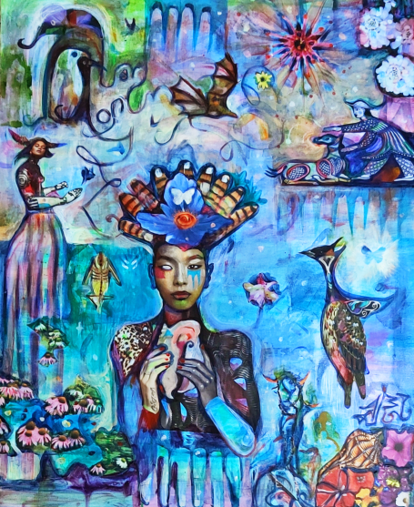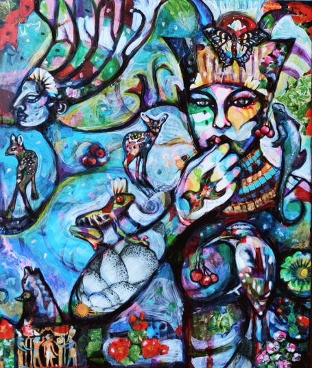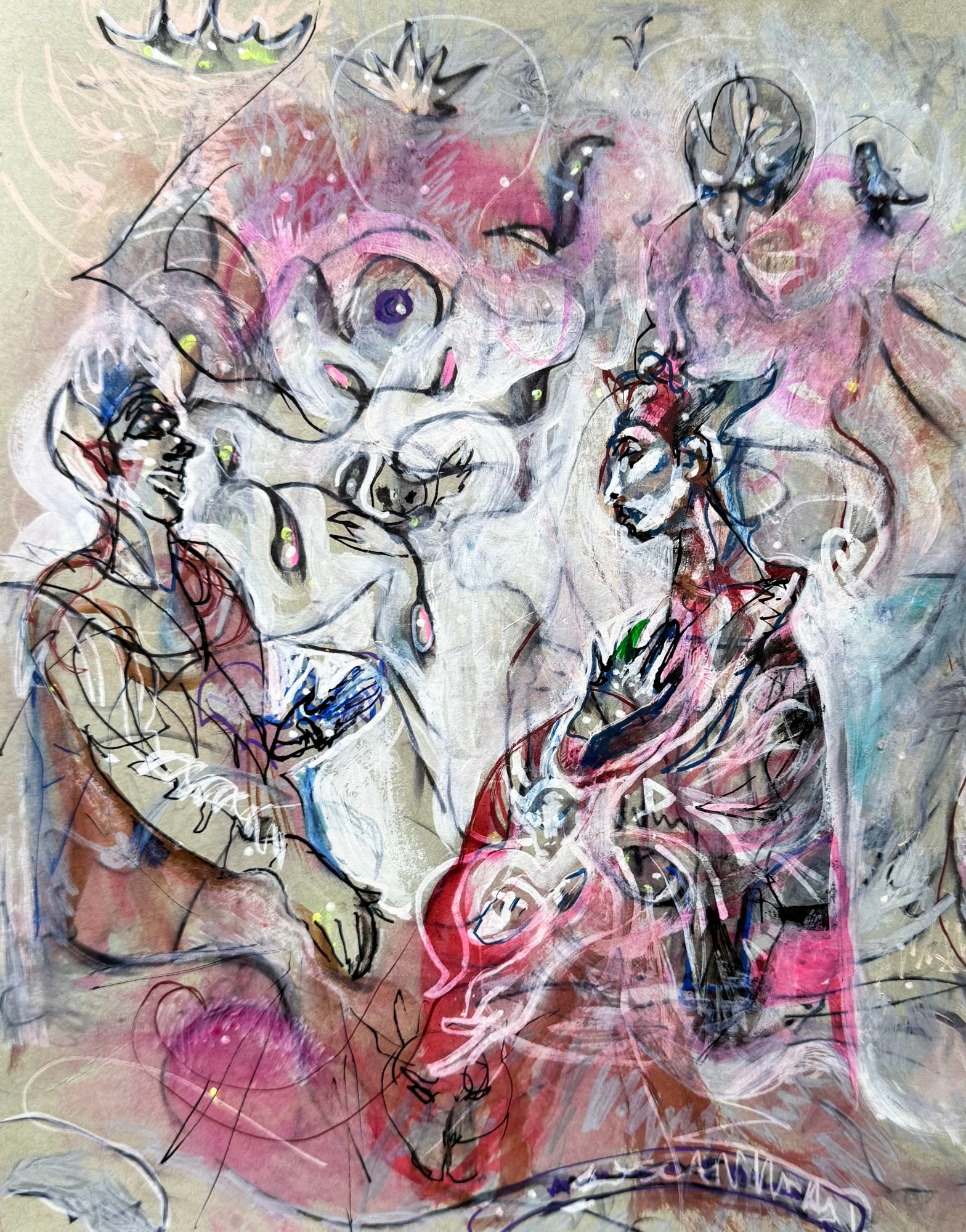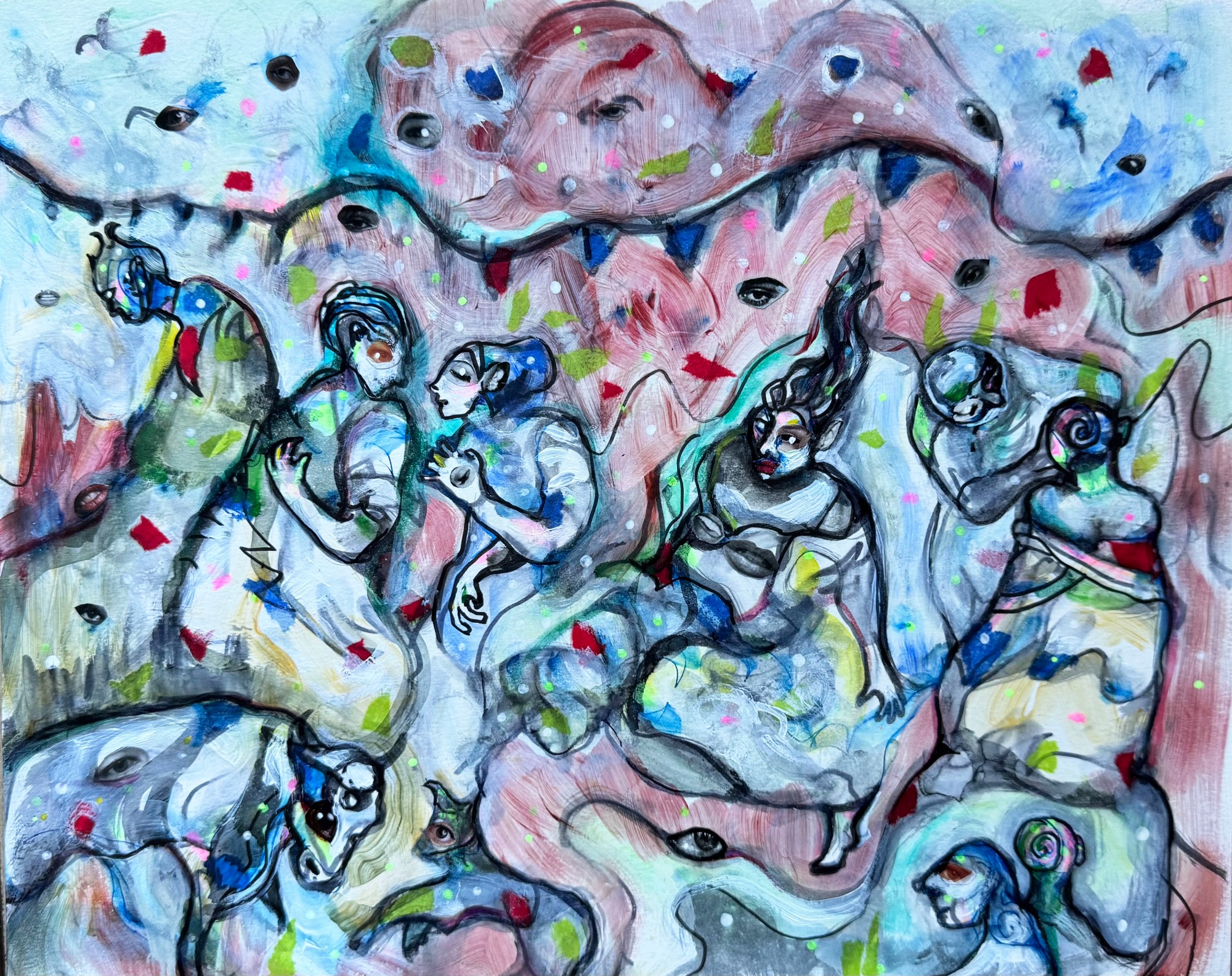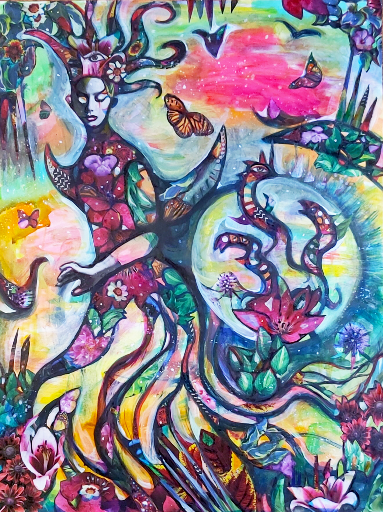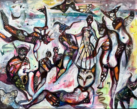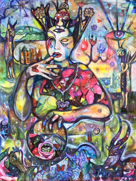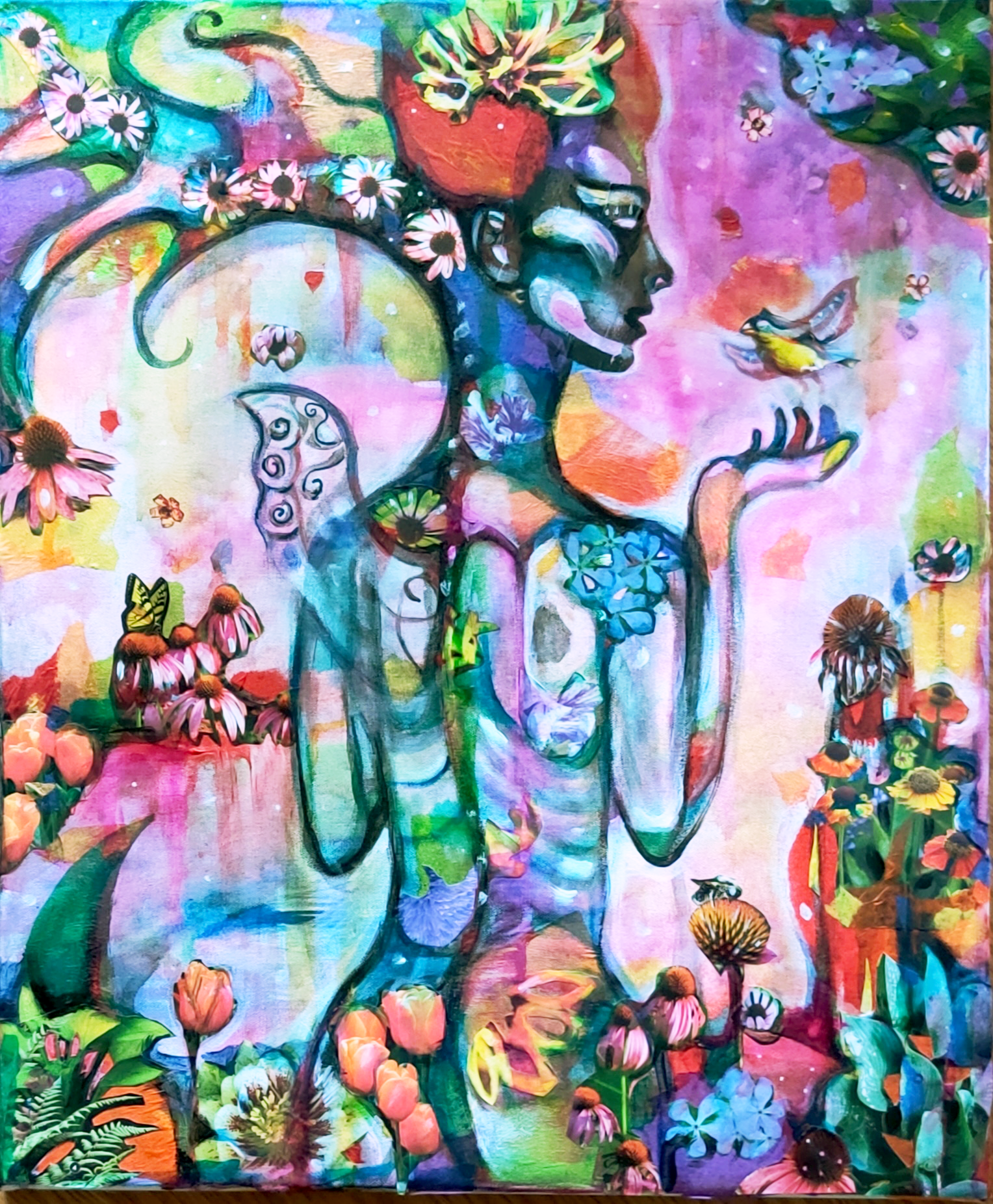 24" x 30" acrylics, collage, and paint pens on canvas (2024)
