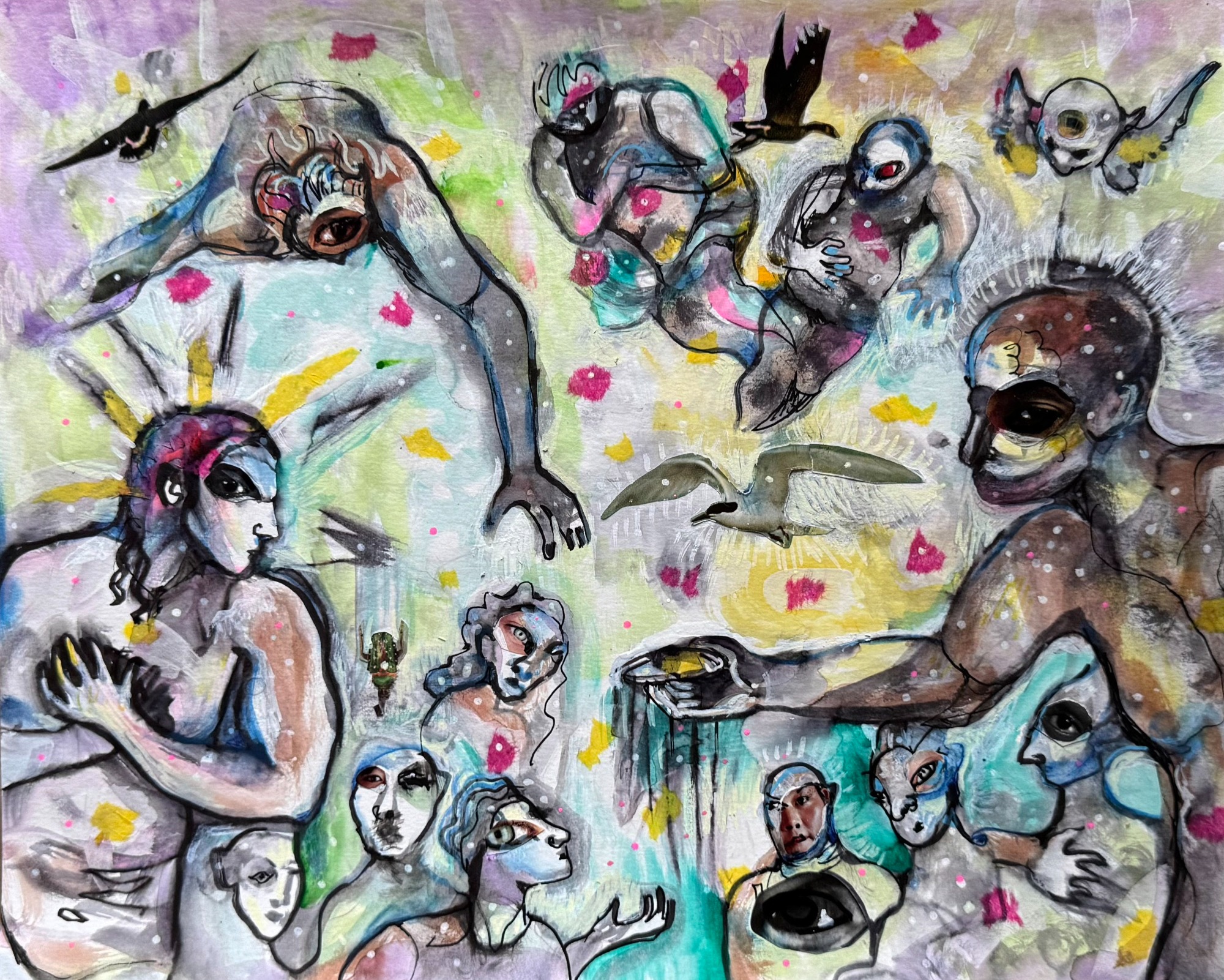 acrylics, collage, and paint pens on paper. 11" x 14" 2022